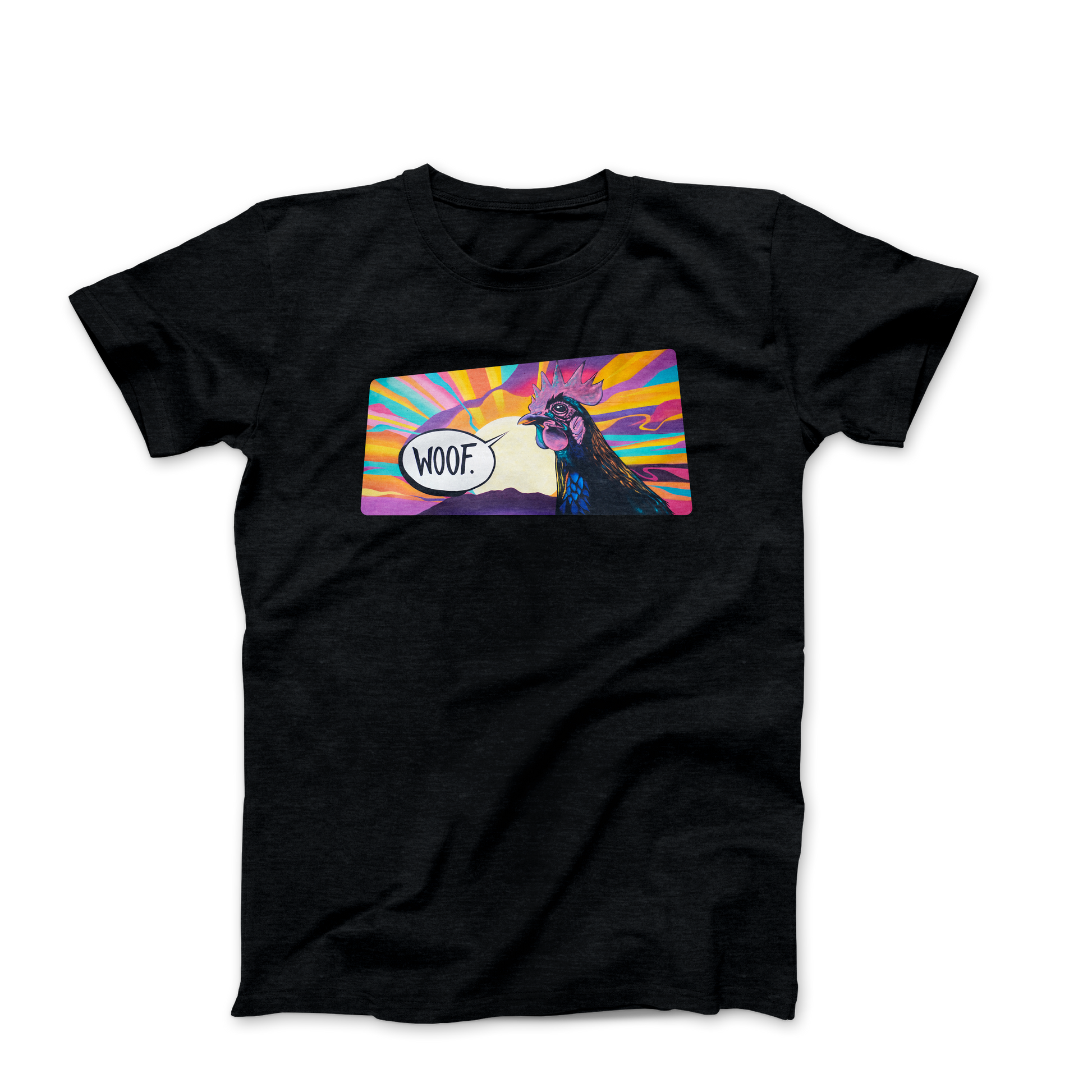 Bring a piece of the wall to your wardrobe. This Fair Oaks Art Wall tee showcases muralist Tim Lindsay’s playful and surreal chicken—standing bold against a radiant sky, declaring a single word: Woof. Printed in full color on soft cotton, it captures the humor, creativity, and offbeat spirit of Fair Oaks’ burgeoning public art scene.